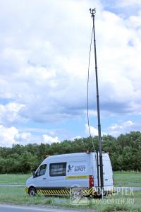 Возможен так же вариант дистанционного управления с джойстика (без опускания мачты для настройки), с поворотной головкой. Подъем штанги осуществляется автоматически с пульта управления с помощью компрессора подкачки воздуха.